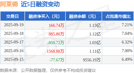 证券之星消息,9月19日,阿莱德(301419)融资买入2603.99万元,融资偿还2437.25万元,融资净买入166.74万元,融资余额1.13亿元。
