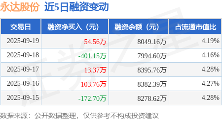 证券之星消息,9月19日,永达股份(001239)融资买入588.1万元,融资偿还533.54万元,融资净买入54.56万元,融资余额8049.16万元,近20个交易日中有11个交易日出现融资净买入。