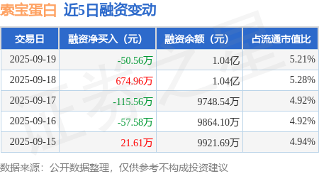证券之星消息,9月19日,索宝蛋白(603231)融资买入701.34万元,融资偿还751.89万元,融资净卖出50.56万元,融资余额1.04亿元。