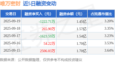 证券之星消息,9月19日,唯万密封(301161)融资买入2201.78万元,融资偿还3424.49万元,融资净卖出1222.71万元,融资余额1.45亿元。