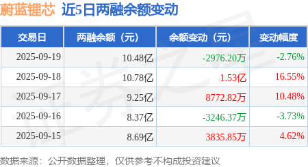证券之星消息,9月19日,蔚蓝锂芯(002245)融资买入2.73亿元,融资偿还3.02亿元,融资净卖出2871.52万元,融资余额10.42亿元,近20个交易日中有13个交易日出现融资净买入。