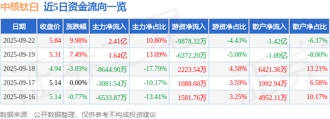 9月22日的资金流向数据方面,主力资金净流入2.41亿元,占总成交额10.8%,游资资金净流出9878.32万元,占总成交额4.43%,散户资金净流出1.42亿元,占总成交额6.37%。