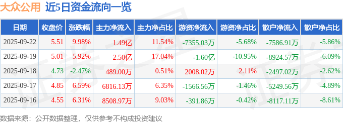 证券之星消息,大众公用9月22日涨停收盘,收盘价5.51元。该股于9点36分涨停,3次打开涨停,截止收盘封单资金为1.59亿元,占其流通市值1.19%。