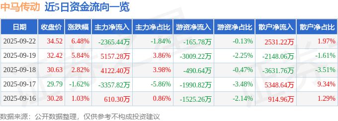 证券之星消息,截至2025年9月22日收盘,中马传动(603767)报收于34.52元,上涨6.48%,换手率12.41%,成交量38.3万手,成交额12.83亿元。