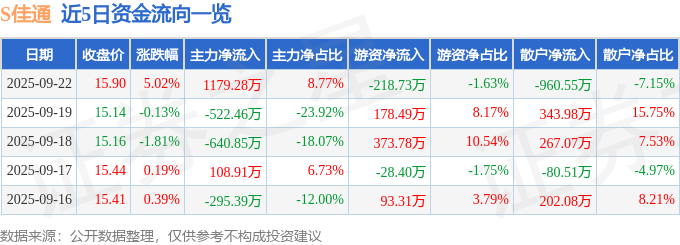 证券之星消息,截至2025年9月22日收盘,S佳通(600182)报收于15.9元,上涨5.02%,涨停,换手率4.99%,成交量8.48万手,成交额1.34亿元。