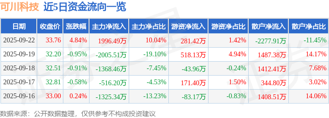证券之星消息,截至2025年9月22日收盘,可川科技(603052)报收于33.76元,上涨4.84%,换手率10.6%,成交量5.99万手,成交额1.99亿元。