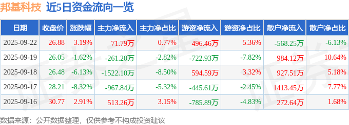 证券之星消息,截至2025年9月22日收盘,邦基科技(603151)报收于26.88元,上涨3.19%,换手率4.19%,成交量3.45万手,成交额9268.52万元。