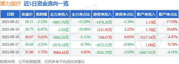 证券之星消息,截至2025年9月22日收盘,塞力医疗(603716)报收于28.11元,下跌2.23%,换手率10.82%,成交量22.74万手,成交额6.42亿元。