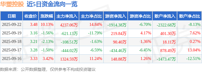 证券之星消息,截至2025年9月22日收盘,华塑控股(000509)报收于3.48元,上涨10.13%,涨停,换手率7.8%,成交量83.74万手,成交额2.86亿元。