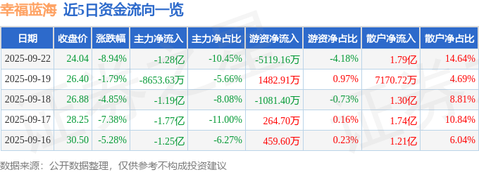 证券之星消息,截至2025年9月22日收盘,幸福蓝海(300528)报收于24.04元,下跌8.94%,换手率13.62%,成交量50.75万手,成交额12.23亿元。