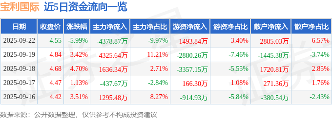 证券之星消息,截至2025年9月22日收盘,宝利国际(300135)报收于4.55元,下跌5.99%,换手率10.25%,成交量94.5万手,成交额4.39亿元。