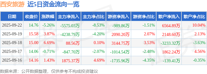 证券之星消息,截至2025年9月22日收盘,西安旅游(000610)报收于14.76元,下跌5.26%,换手率18.59%,成交量43.77万手,成交额6.54亿元。