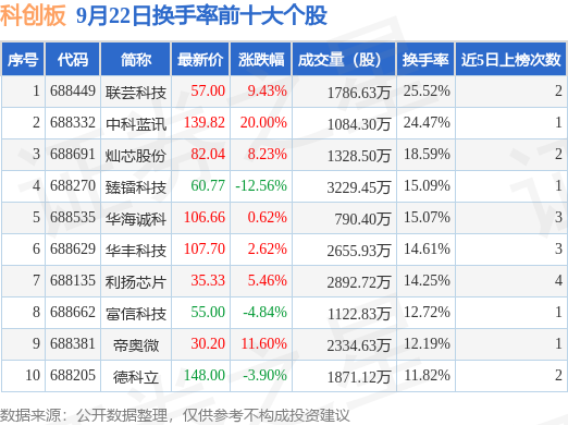 当日科创板换手率前10大个股中7只个股收涨,平均涨幅8.28%,其中联芸科技(688449)以换手率25.52%排第一,6只个股近5个交易日中多次上榜。