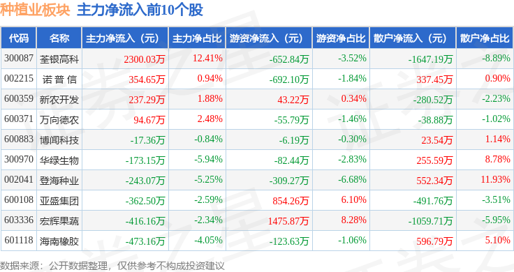 从资金流向上来看,当日种植业板块主力资金净流出1.04亿元,游资资金净流入1612.24万元,散户资金净流入8821.8万元。种植业板块个股资金流向见下表: