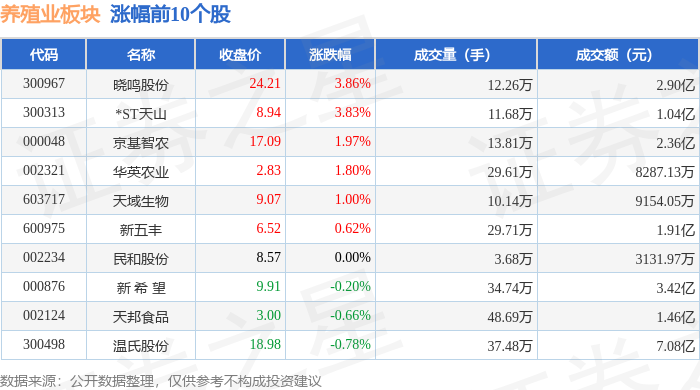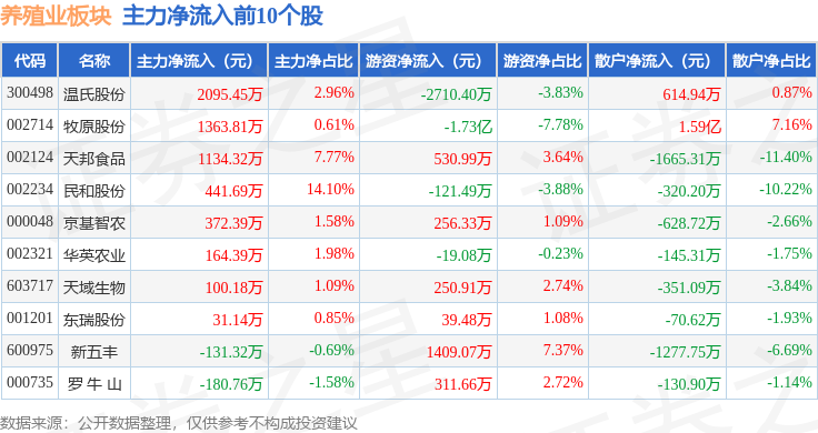 从资金流向上来看,当日养殖业板块主力资金净流出7030.48万元,游资资金净流出6749.01万元,散户资金净流入1.38亿元。养殖业板块个股资金流向见下表: