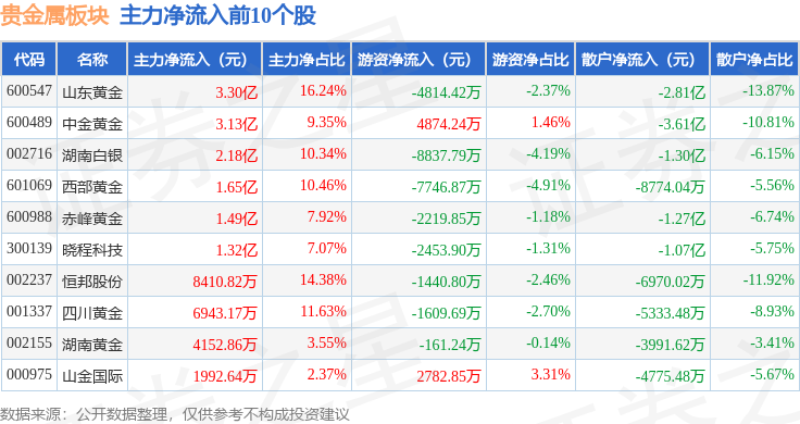 从资金流向上来看,当日贵金属板块主力资金净流入15.27亿元,游资资金净流出2.24亿元,散户资金净流出13.03亿元。贵金属板块个股资金流向见下表: