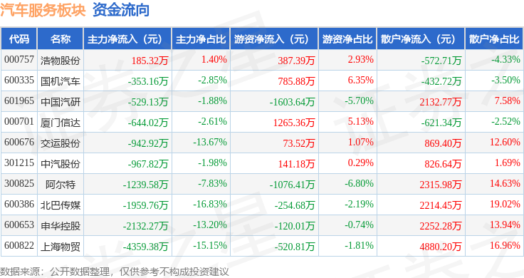 从资金流向上来看,当日汽车服务板块主力资金净流出1.29亿元,游资资金净流出922.21万元,散户资金净流入1.39亿元。汽车服务板块个股资金流向见下表: