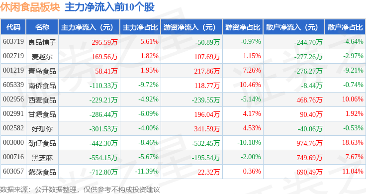 从资金流向上来看,当日休闲食品板块主力资金净流出2.07亿元,游资资金净流入17.63万元,散户资金净流入2.06亿元。休闲食品板块个股资金流向见下表: