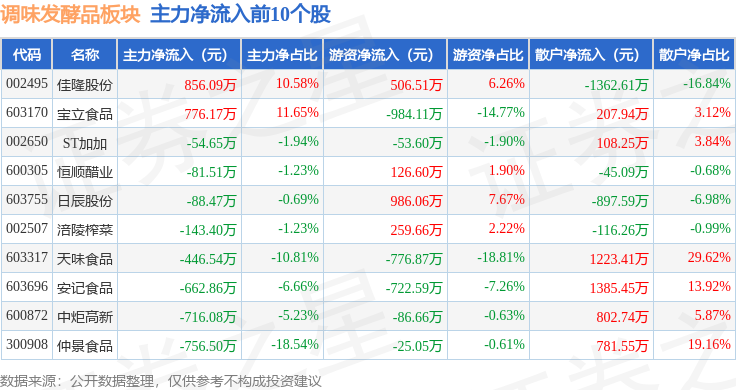 从资金流向上来看,当日调味发酵品板块主力资金净流出1.23亿元,游资资金净流入2877.81万元,散户资金净流入9450.05万元。调味发酵品板块个股资金流向见下表: