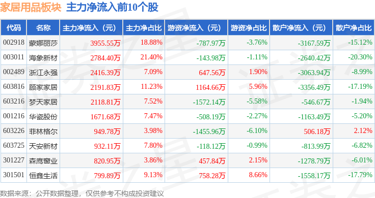 从资金流向上来看,当日家居用品板块主力资金净流出1.3亿元,游资资金净流入1.87亿元,散户资金净流出5656.78万元。家居用品板块个股资金流向见下表: