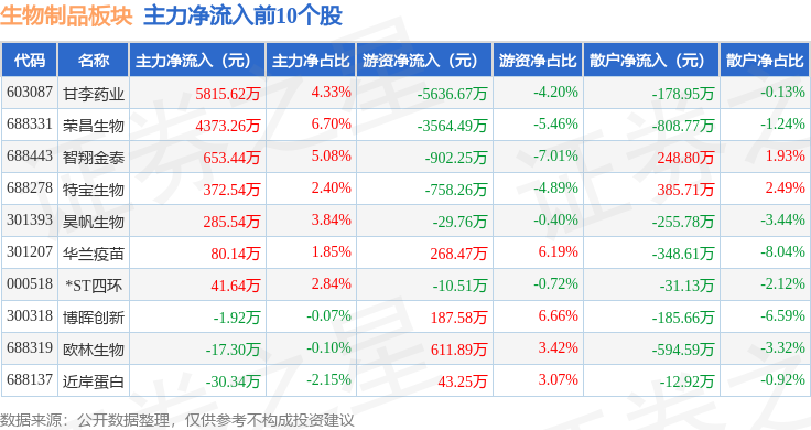 从资金流向上来看,当日生物制品板块主力资金净流出4.73亿元,游资资金净流入5499.54万元,散户资金净流入4.18亿元。生物制品板块个股资金流向见下表:
