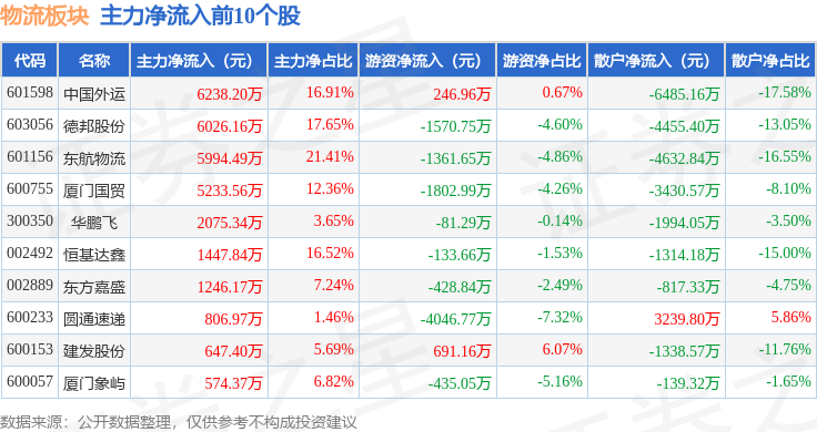 从资金流向上来看,当日物流板块主力资金净流出1.24亿元,游资资金净流出6803.92万元,散户资金净流入1.92亿元。物流板块个股资金流向见下表: