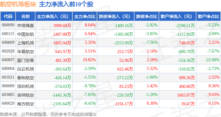 从资金流向上来看,当日航空机场板块主力资金净流出1.26亿元,游资资金净流出7.94万元,散户资金净流入1.26亿元。航空机场板块个股资金流向见下表: