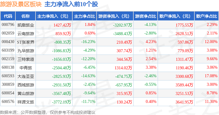 从资金流向上来看,当日旅游及景区板块主力资金净流出11.66亿元,游资资金净流入6539.24万元,散户资金净流入11.01亿元。旅游及景区板块个股资金流向见下表: