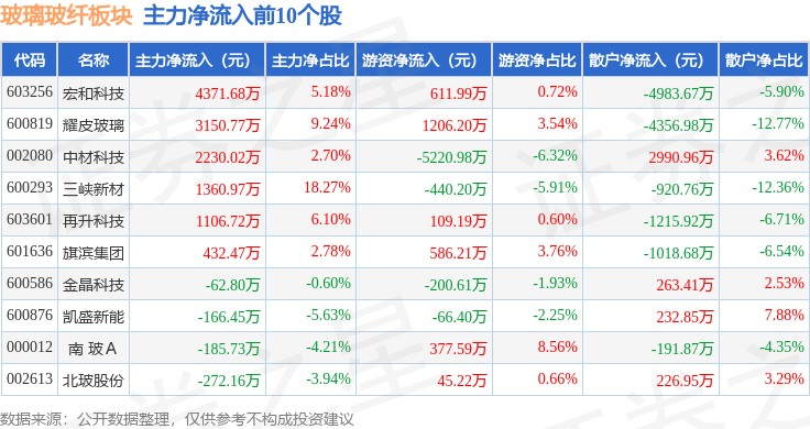 从资金流向上来看,当日玻璃玻纤板块主力资金净流入2219.84万元,游资资金净流出5245.36万元,散户资金净流入3025.52万元。玻璃玻纤板块个股资金流向见下表: