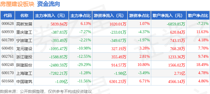 从资金流向上来看,当日房屋建设板块主力资金净流出1.83亿元,游资资金净流出1.15亿元,散户资金净流入2.97亿元。房屋建设板块个股资金流向见下表: