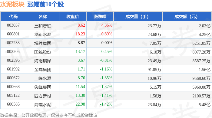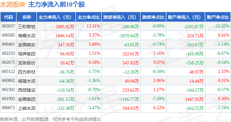 从资金流向上来看,当日水泥板块主力资金净流出3.06亿元,游资资金净流入9096.75万元,散户资金净流入2.15亿元。水泥板块个股资金流向见下表: