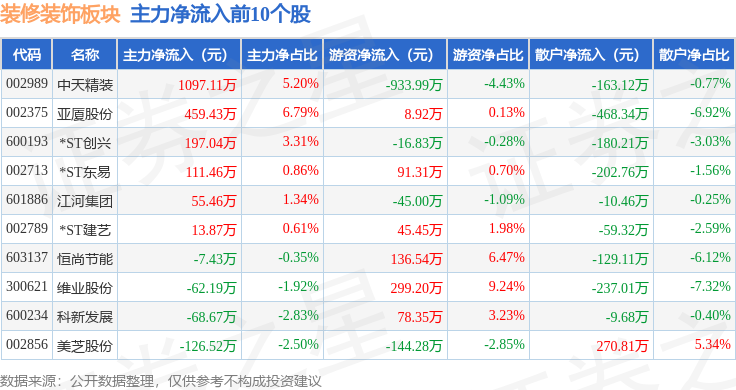 从资金流向上来看,当日装修装饰板块主力资金净流出8572.65万元,游资资金净流入3913.49万元,散户资金净流入4659.17万元。装修装饰板块个股资金流向见下表: