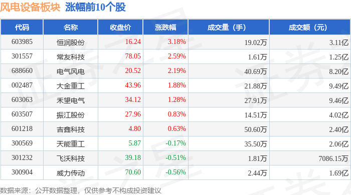 从资金流向上来看,当日风电设备板块主力资金净流出3.06亿元,游资资金净流入1.0亿元,散户资金净流入2.06亿元。风电设备板块个股资金流向见下表:
