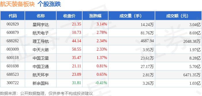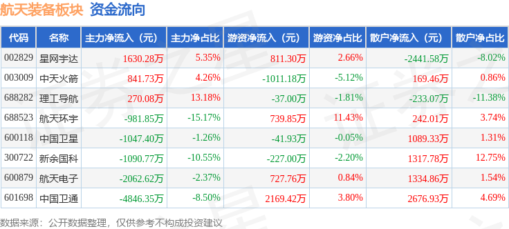 从资金流向上来看,当日航天装备板块主力资金净流出7286.91万元,游资资金净流入3131.21万元,散户资金净流入4155.7万元。航天装备板块个股资金流向见下表: