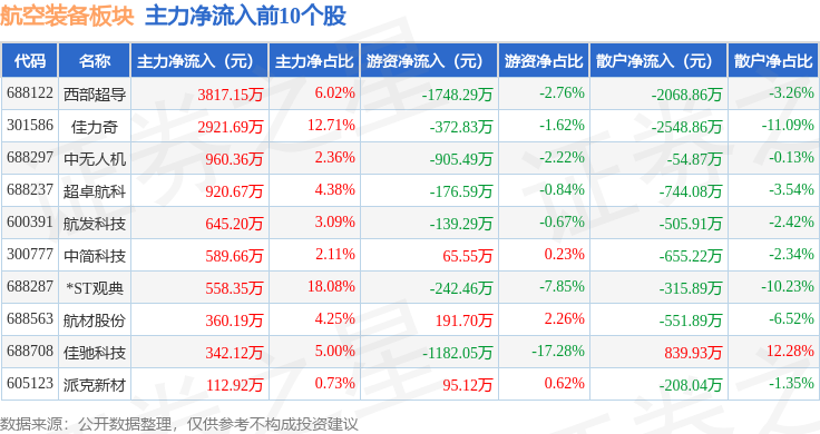 从资金流向上来看,当日航空装备板块主力资金净流出6.0亿元,游资资金净流出6977.7万元,散户资金净流入6.7亿元。航空装备板块个股资金流向见下表: