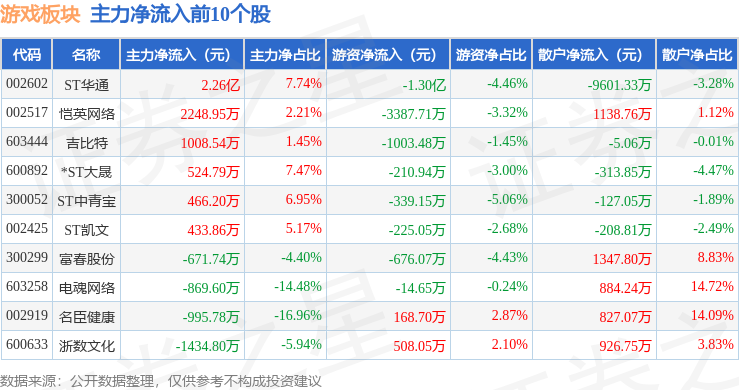 从资金流向上来看,当日游戏板块主力资金净流出14.84亿元,游资资金净流出9751.36万元,散户资金净流入15.82亿元。游戏板块个股资金流向见下表: