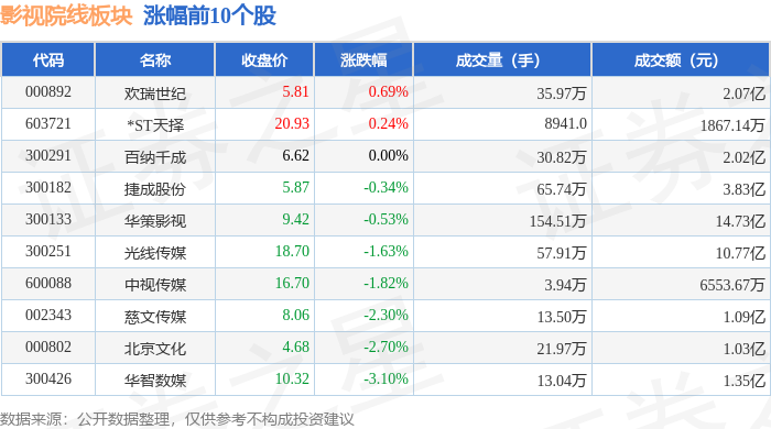 证券之星消息,9月22日影视院线板块较上一交易日下跌4.0%,金逸影视领跌。当日上证指数报收于3828.58,上涨0.22%。深证成指报收于13157.97,上涨0.67%。影视院线板块个股涨跌见下表: