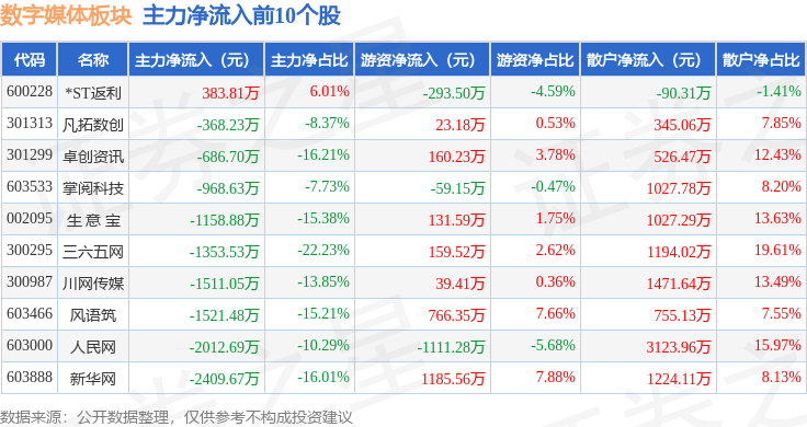 从资金流向上来看,当日数字媒体板块主力资金净流出2.16亿元,游资资金净流出8142.78万元,散户资金净流入2.98亿元。数字媒体板块个股资金流向见下表: