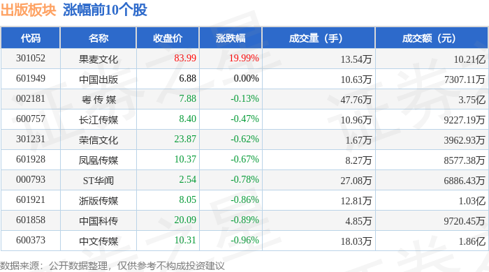 证券之星消息,9月22日出版板块较上一交易日下跌0.71%,新经典领跌。当日上证指数报收于3828.58,上涨0.22%。深证成指报收于13157.97,上涨0.67%。出版板块个股涨跌见下表: