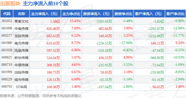 从资金流向上来看,当日出版板块主力资金净流出8845.98万元,游资资金净流出3893.63万元,散户资金净流入1.27亿元。出版板块个股资金流向见下表: