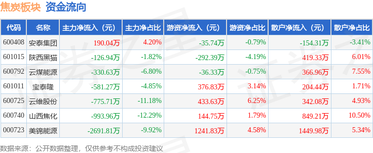从资金流向上来看,当日焦炭板块主力资金净流出5310.27万元,游资资金净流入1832.58万元,散户资金净流入3477.69万元。焦炭板块个股资金流向见下表: