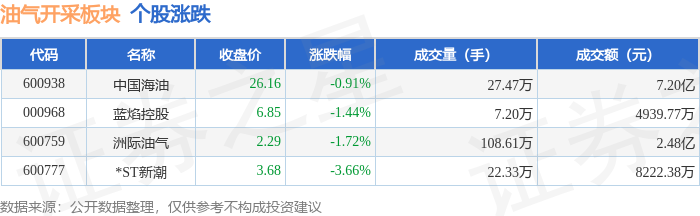 证券之星消息,9月22日油气开采板块较上一交易日下跌1.56%,*ST新潮领跌。当日上证指数报收于3828.58,上涨0.22%。深证成指报收于13157.97,上涨0.67%。油气开采板块个股涨跌见下表: