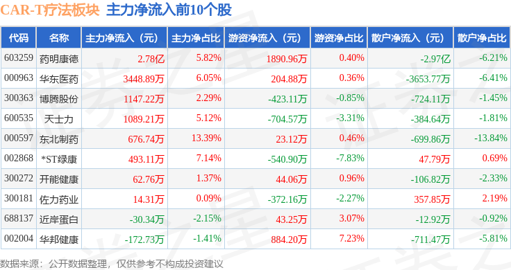 从资金流向上来看,当日CAR-T疗法板块主力资金净流出1.39亿元,游资资金净流入1266.18万元,散户资金净流入1.26亿元。CAR-T疗法板块个股资金流向见下表: