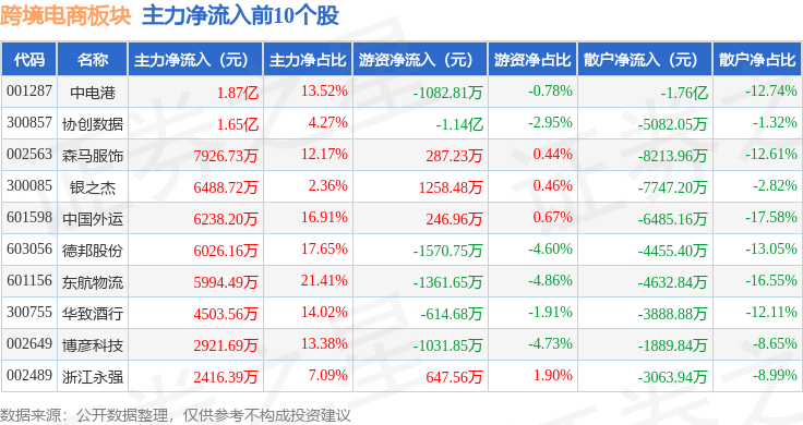 从资金流向上来看,当日跨境电商板块主力资金净流出15.99亿元,游资资金净流入1.71亿元,散户资金净流入14.28亿元。跨境电商板块个股资金流向见下表: