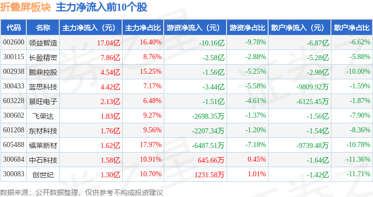 从资金流向上来看,当日折叠屏板块主力资金净流入26.06亿元,游资资金净流出14.43亿元,散户资金净流出11.63亿元。折叠屏板块个股资金流向见下表: