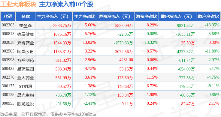 从资金流向上来看,当日工业大麻板块主力资金净流出3.16亿元,游资资金净流入1.13亿元,散户资金净流入2.03亿元。工业大麻板块个股资金流向见下表: