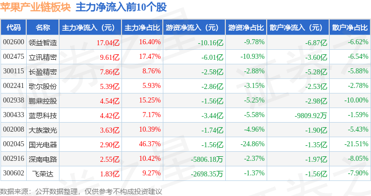 从资金流向上来看,当日苹果产业链板块主力资金净流入27.87亿元,游资资金净流出20.29亿元,散户资金净流出7.58亿元。苹果产业链板块个股资金流向见下表:
