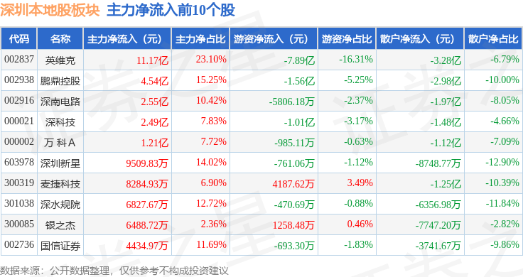 从资金流向上来看,当日深圳本地股板块主力资金净流入13.52亿元,游资资金净流出6.72亿元,散户资金净流出6.79亿元。深圳本地股板块个股资金流向见下表: