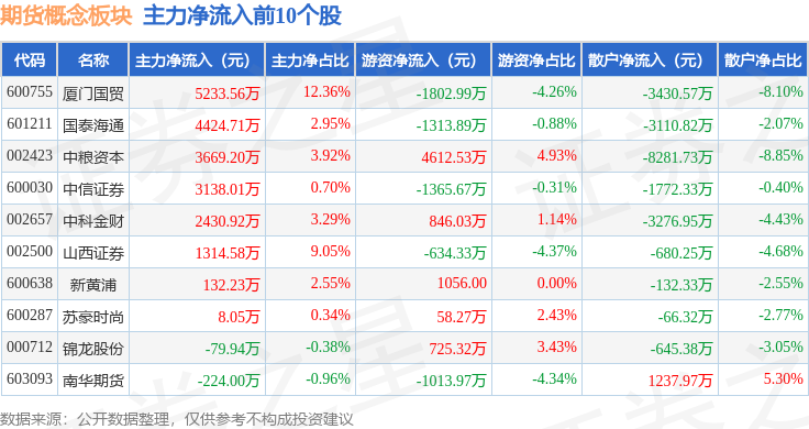 从资金流向上来看,当日期货概念板块主力资金净流出7317.7万元,游资资金净流入1.58亿元,散户资金净流出8471.69万元。期货概念板块个股资金流向见下表: