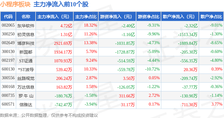 从资金流向上来看,当日小程序板块主力资金净流入4.89亿元,游资资金净流出3.66亿元,散户资金净流出1.24亿元。小程序板块个股资金流向见下表: